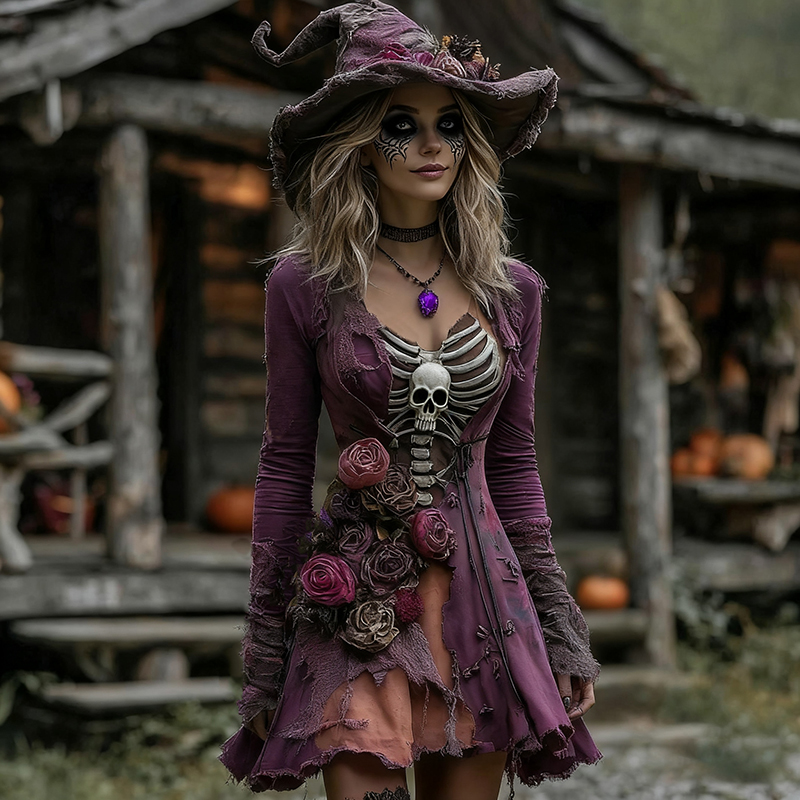 Women's Halloween Rose Skeleton Witch Cosplay Midi Dress