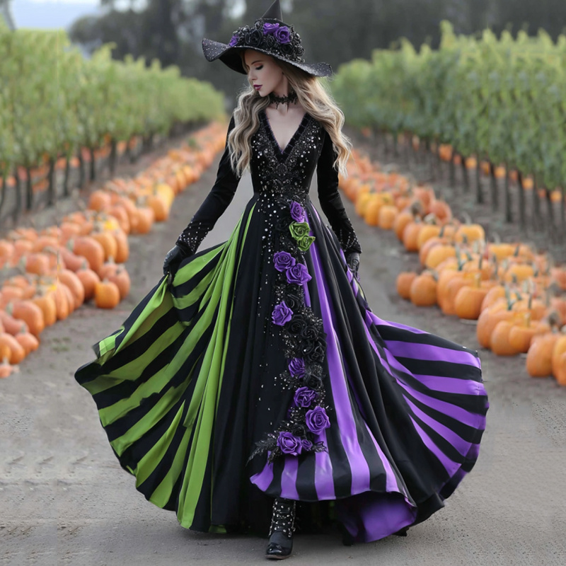 Women's Halloween Black Green Purple Stripes Art Comfy Velvet V Neck Maxi Dress
